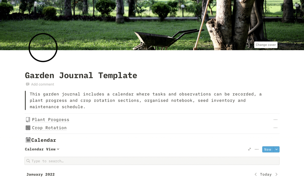 This garden journal template in notion includes a calendar where tasks and observations can be recorded, a plant progress and crop rotation sections, organised notebook, seed inventory and maintenance schedule.